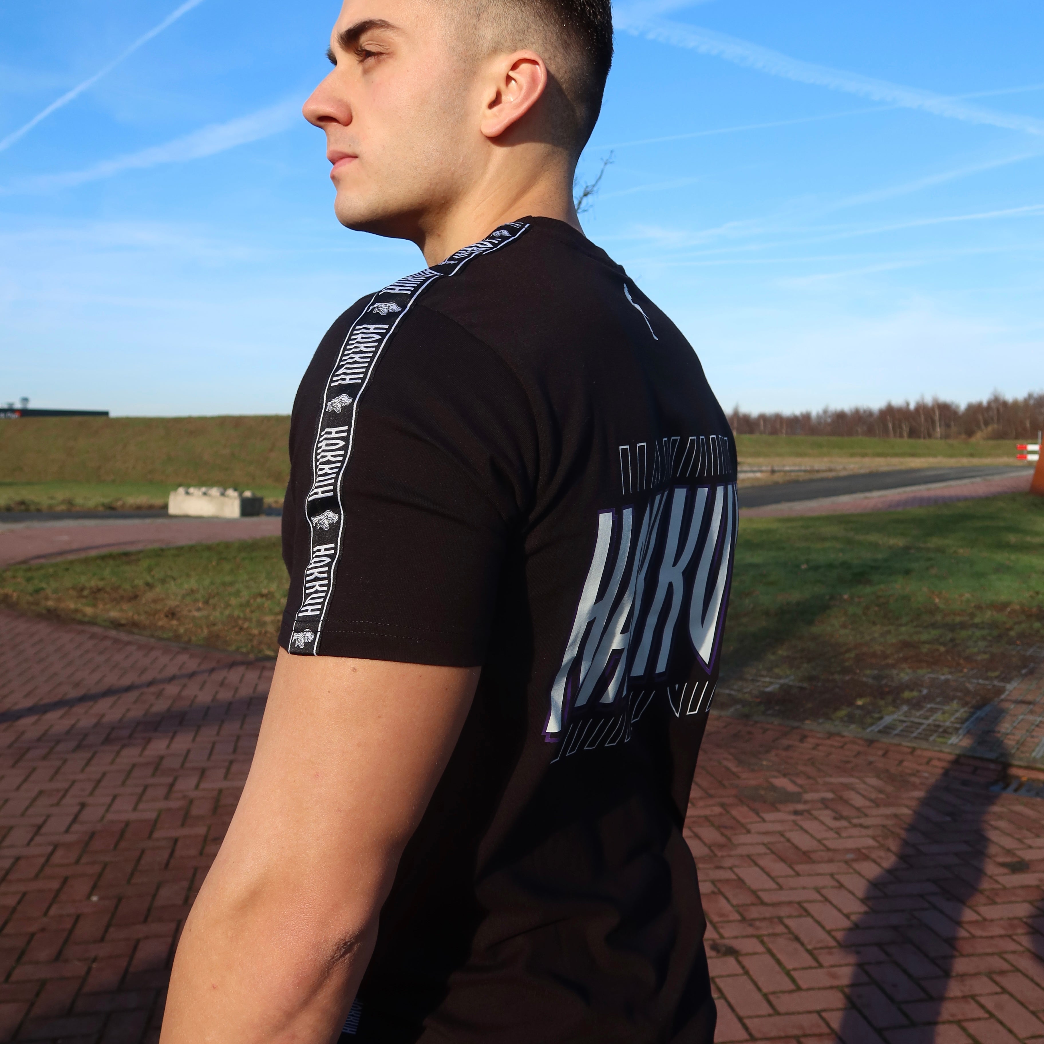 Angled HAKKUH lettering in vivid purple creates a bold, kinetic graphic that reads well in motion and in photos. It's designed to stand out at festivals and onstage without overwhelming the garment.